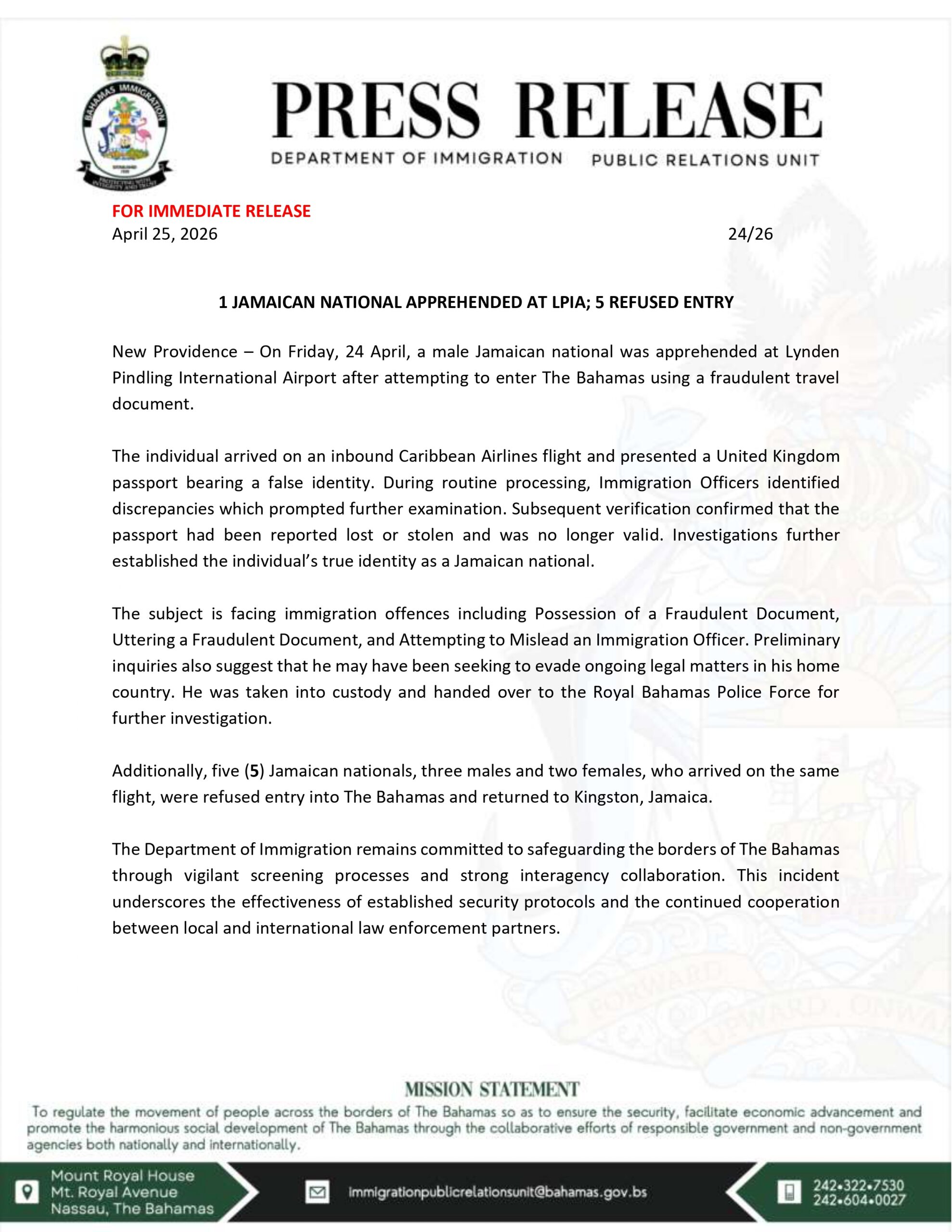 1 Jamaican National Apprehended at LPIA; 5 Refused Entry