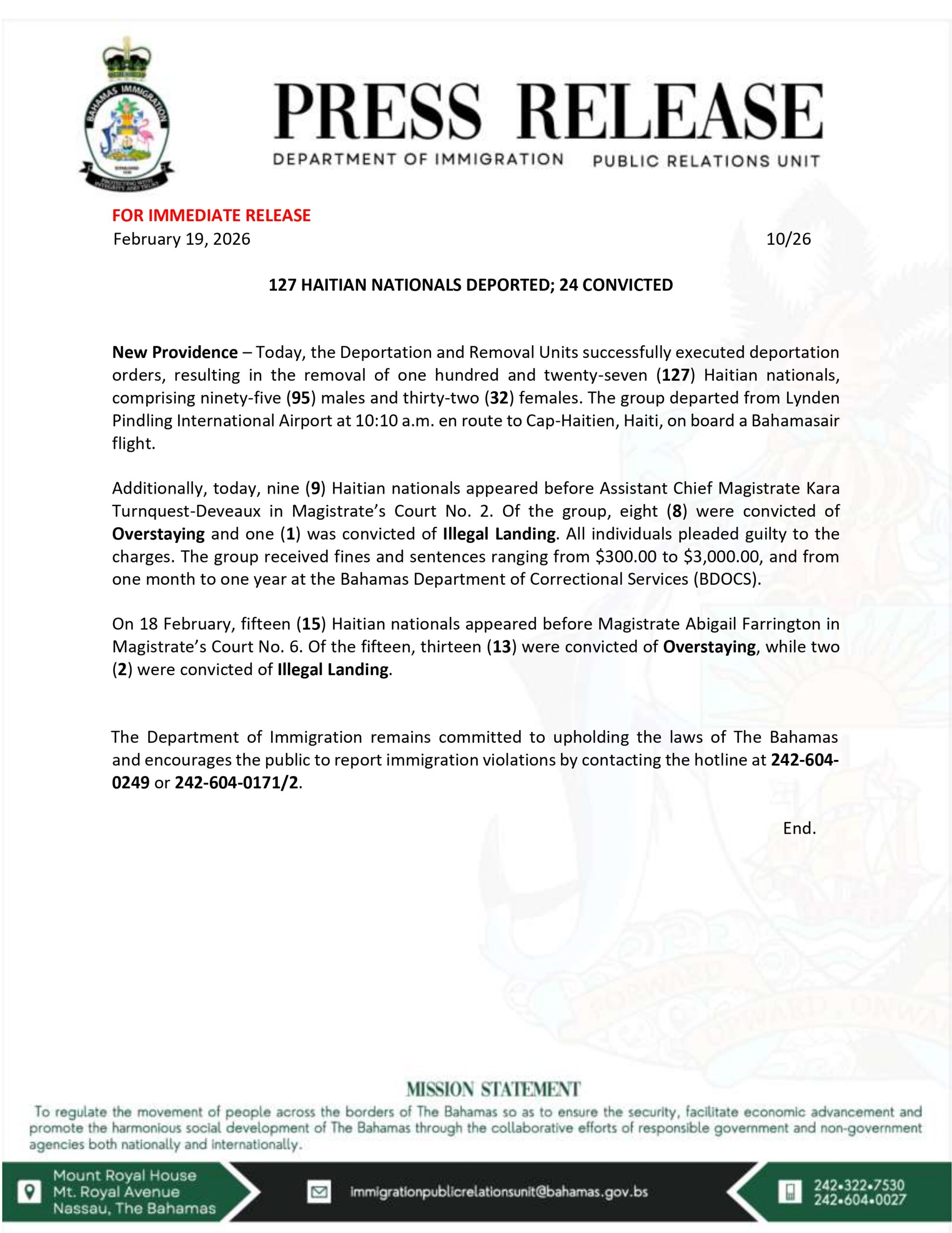 • 127 Haitian Nationals Deported; 24 Convicted