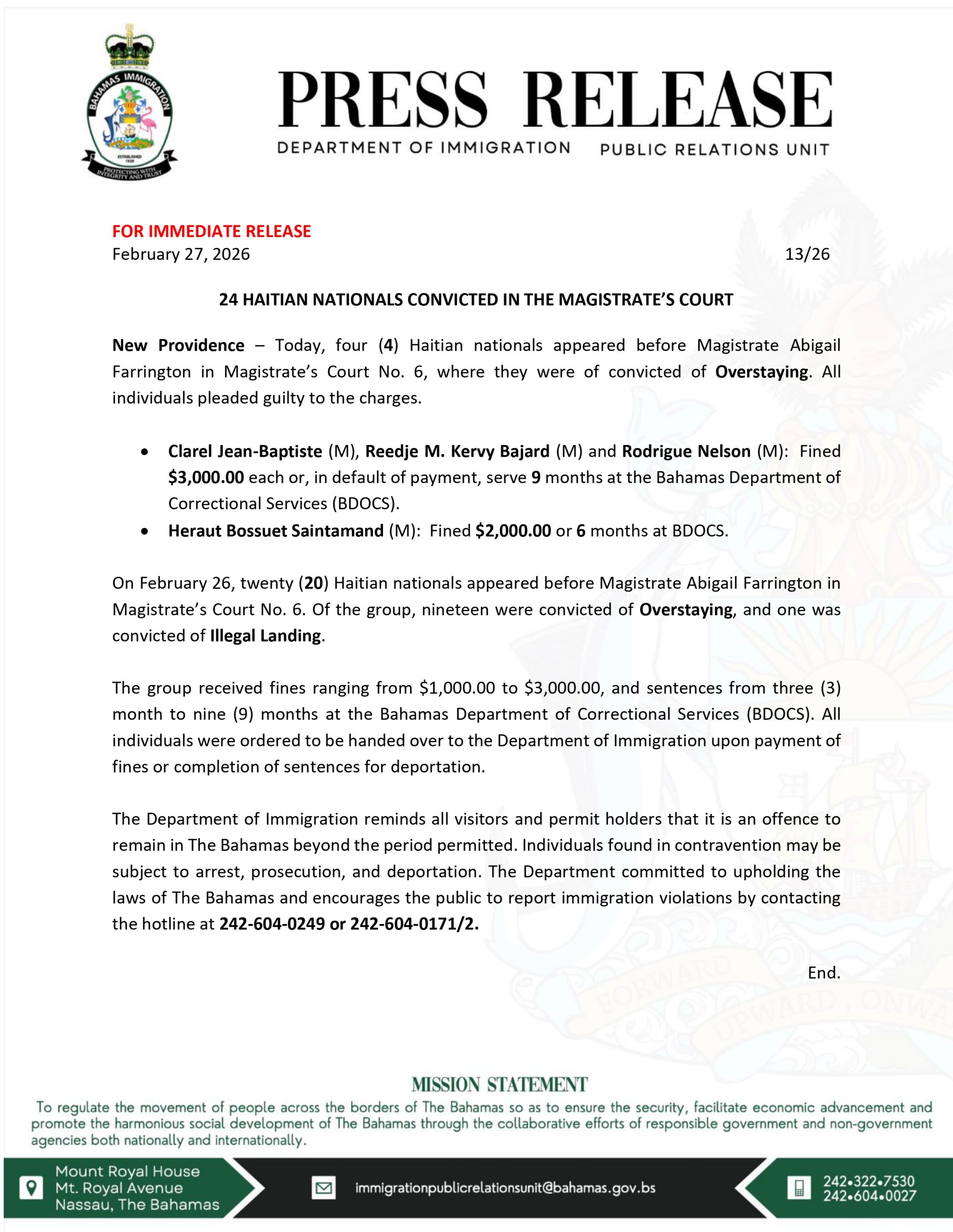 24 Haitian Nationals Convicted in the Magistrate’s Court Posted on 27-Feb-2026 04:13:42 All News 24 Haitian Nationals Convicted in the Magistrate’s Court Reminder: Suspension of the Temporary Electronic Extension eService 22 Haitian Nationals Convicted in the Magistrate’s Court 127 Haitian Nationals Deported; 24 Convicted 13 Haitian Nationals Convicted in the Magistrate’s Court