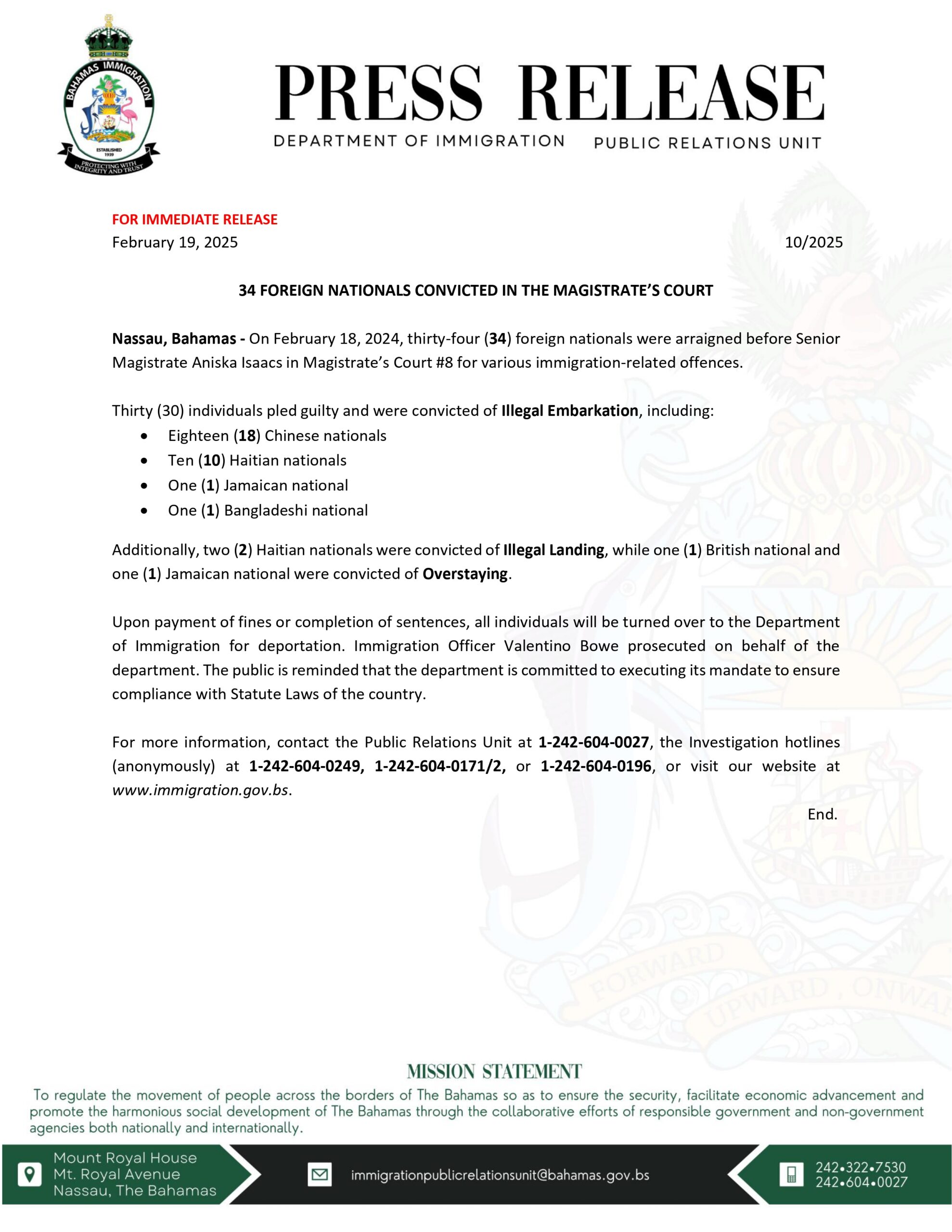 Press Release No 10/2025 – 34 Foreign Nationals Convicted in the Magistrate’s Court