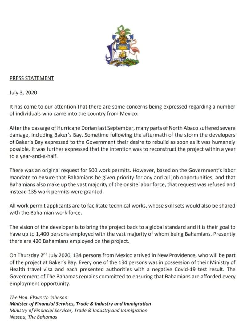 3rd July, 2020 – Press Statement: Ministry of Financial Services, Trade & Industry and Immigration