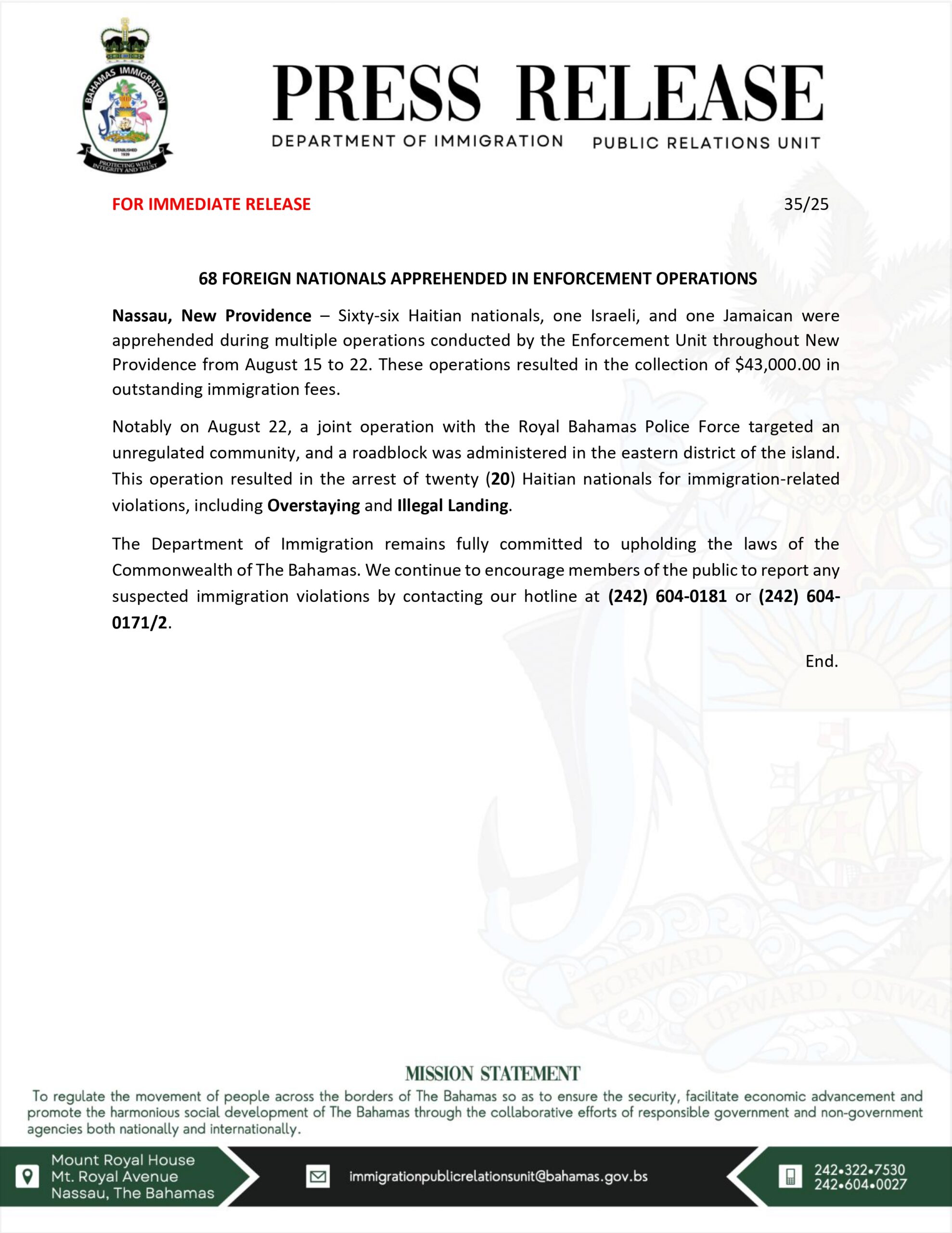 68 Foreign Nationals Apprehended in Enforcement Operations
