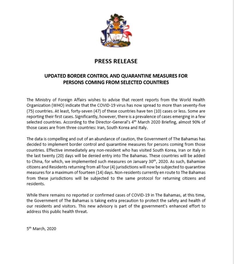UPDATED BORDER CONTROL AND QUARANTINE MEASURES FOR PERSONS COMING FROM SELECTED COUNTRIES