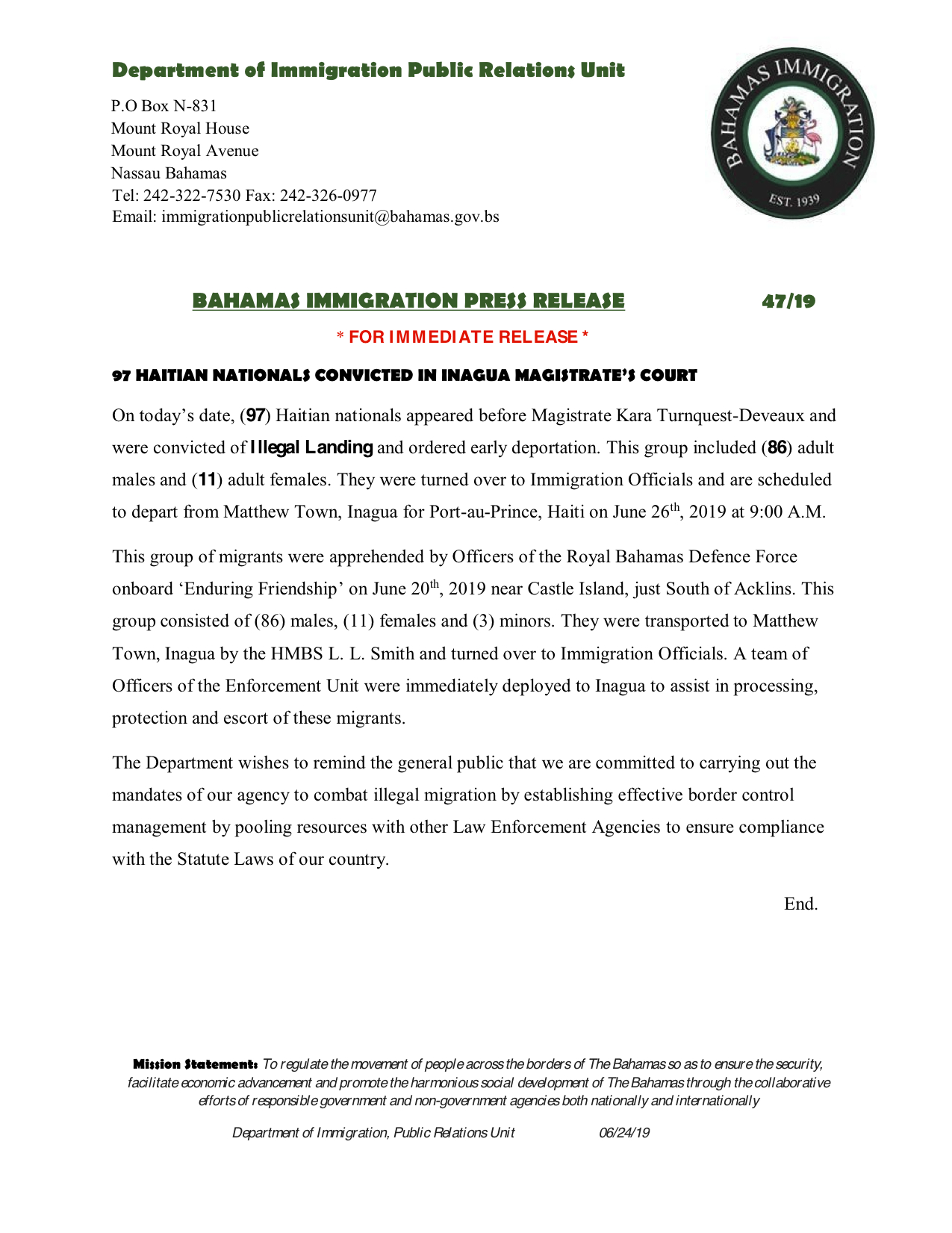 97 Haitian Nationals Convicted in Inagua Magistrate’s Court