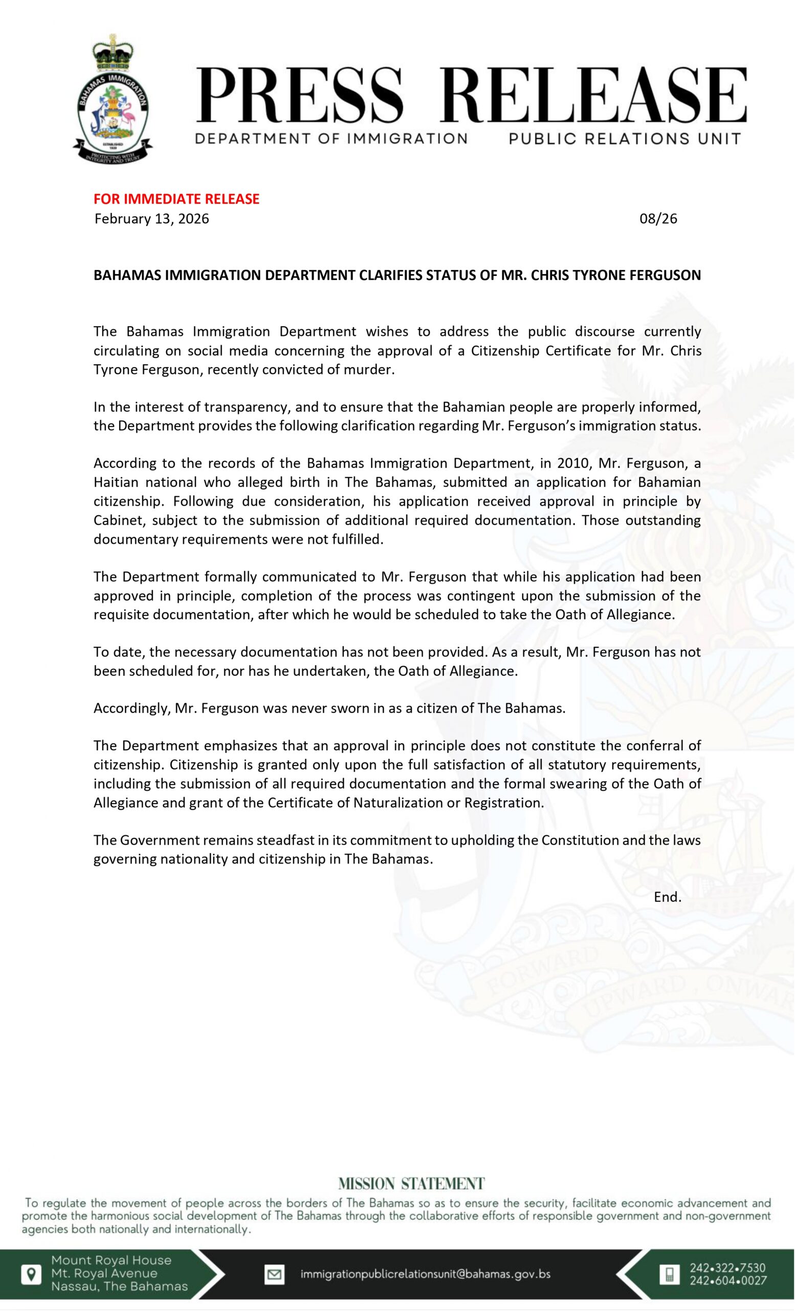 Department Clarifies Status of Mr. Chris Tyrone Ferguson Posted on 13-Feb-2026 05:53:31 All News 13 Haitian Nationals Convicted in the Magistrate’s Court Department Clarifies Status of Mr. Chris Tyrone Ferguson 34 Haitian Nationals Convicted in the Magistrate’s Court this Week 48 Foreign Nationals Convicted in the Magistrate’s Court 25 Foreign Nationals Convicted in the Magistrate’s Court