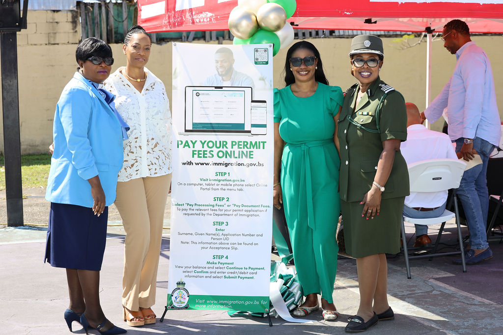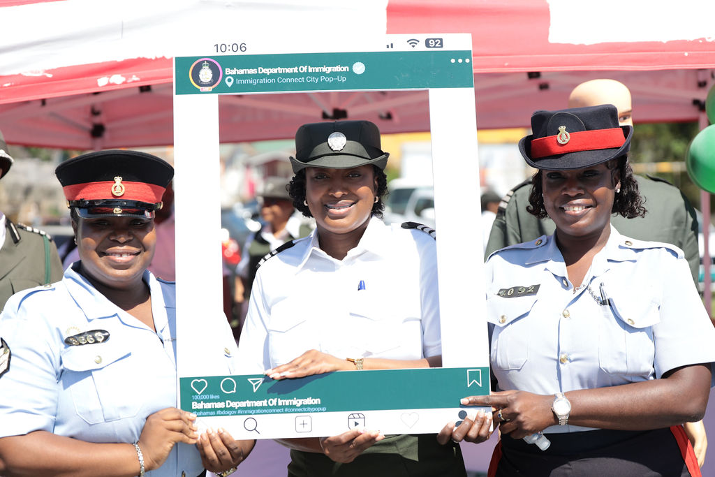 On February 28, the Department of Immigration officially launched the Immigration Connect: City Pop-Up series at Christie Park, Nassau Street, with a ribbon-cutting ceremony led by the Minister of Immigration and National Insurance, the Hon. Alfred Sears. Joining him for the ceremony were Acting Permanent Secretary Sharon Pratt-Rolle, Acting Director Rudolph Ferguson, and Superintendent Shemah Saunders-Darling, marking the beginning of a successful event series.