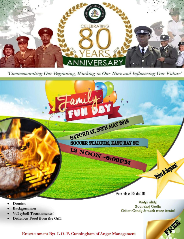 Special Thanks and Praise is extended to the Immigration Department’s Social and Welfare Club and the 80th Anniversary Team for their brilliance in hosting our Family Fun Day at the Nation’s Beach Soccer Field – just under the Bridge, East Bay Street. It was certainly a 1st Class Grand Occasion that we won’t soon forget. The bouncing castle, pony rides, petting corner, volleyball games, domino tournament and FREE FOOD was delectable! Ambulatory services turned up and out but gratefully was NOT needed and both Senior, Junior and civilian and Officers support was just incredible. The Director of Immigration stood and continue to stand PROUD of your achievements overall; with such limited resources but Public Support. To Supt. Mispah Smith (Co-ordinator), CIO Rudy Ferguson (Sports Co-ordinator), Superintendents Minus, Joseph (Grill Master), Armbrister, Ephraim Rolle, COI Thurston and Gordon, David Rolle K9, Brown, Taylor, Adderley and his entire Security Detail, PS Cora Colebrooke for coming out and your support, ADOI’s Ferguson and Beneby, Docks and LPIA Competitive Volleyball Teams, FAS Karen Neilly and the entire Civilian Support Staff in attendance (Xavier and Ross in particular) and all others – including (Mr. Wilson the Host President of the venue for your support and presentation “We thank you” and your soccer team for your contribution Sir), to ALL AND SUNDRY (Press Included) who made our event a Spectacular Success WE THANK YOU KINDLY on a job well done! Hoorahhhhhhhhh.