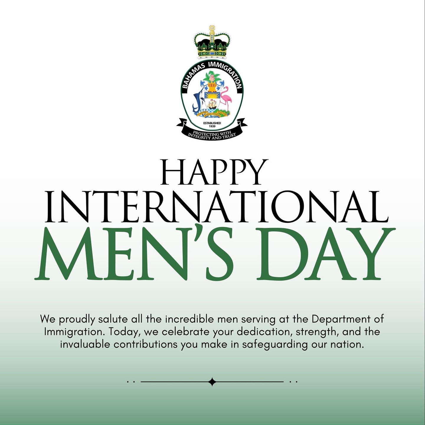 We proudly salute all the incredible men serving at the Department of Immigration. Today, we celebrate your dedication, strength, and the invaluable contributions you make in safeguarding our nation.