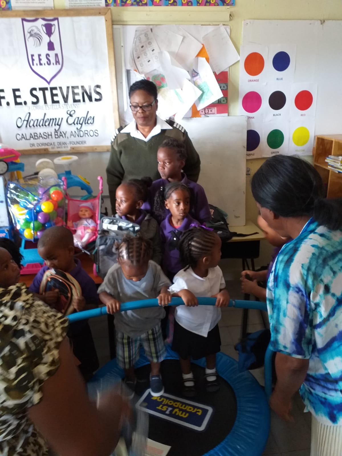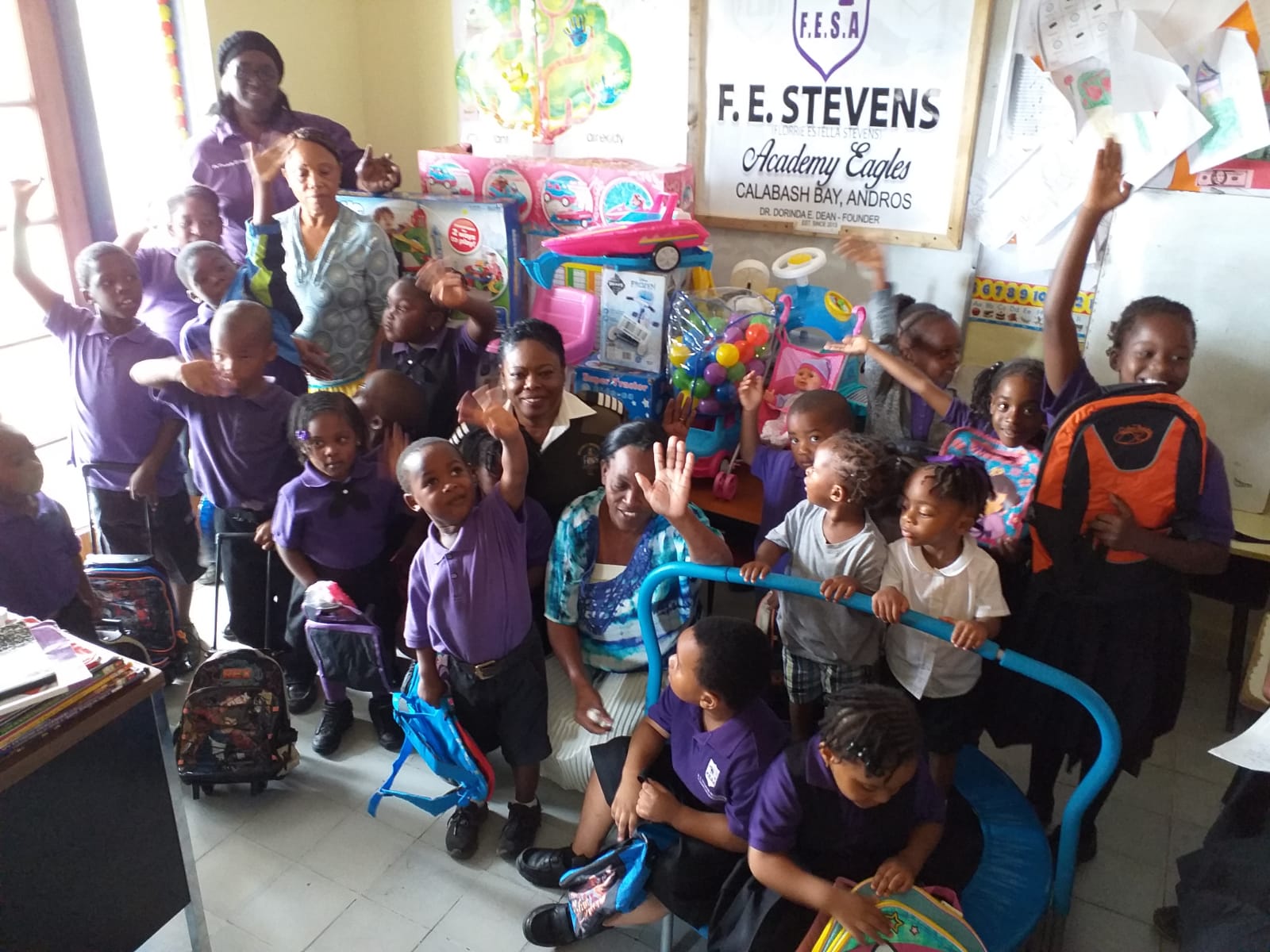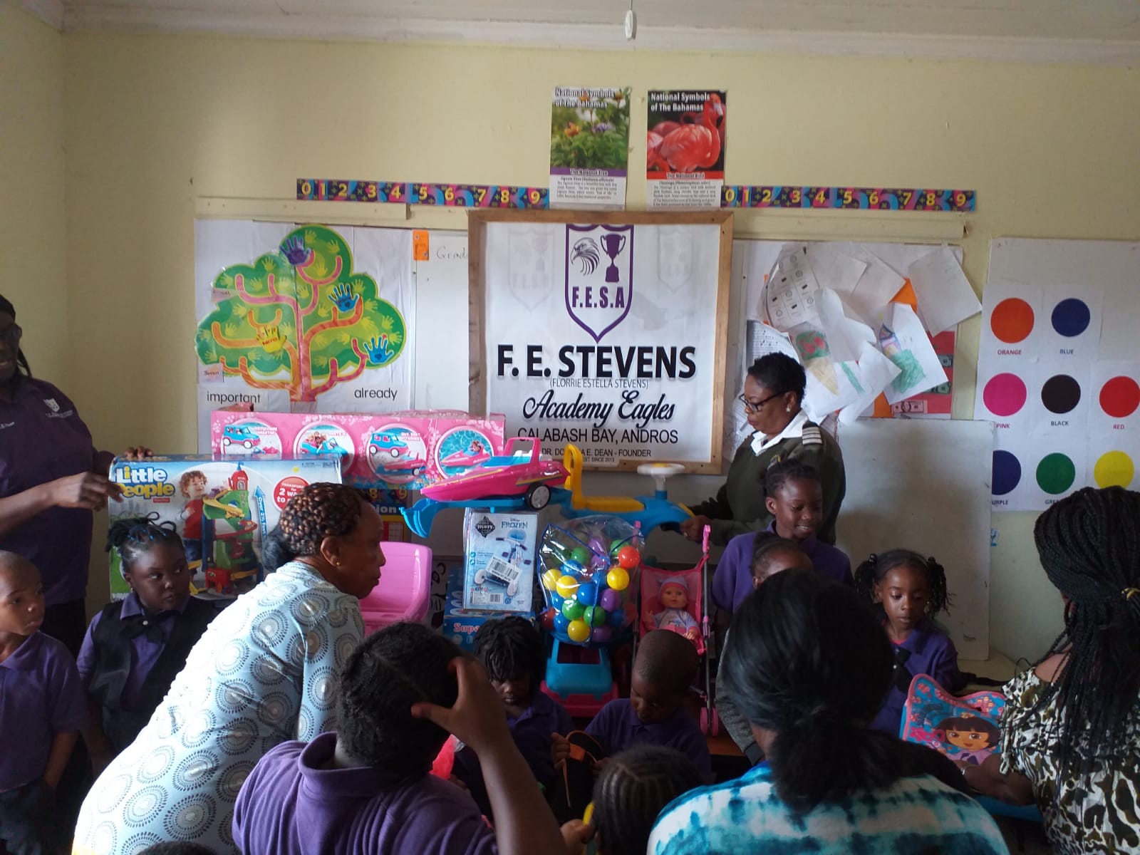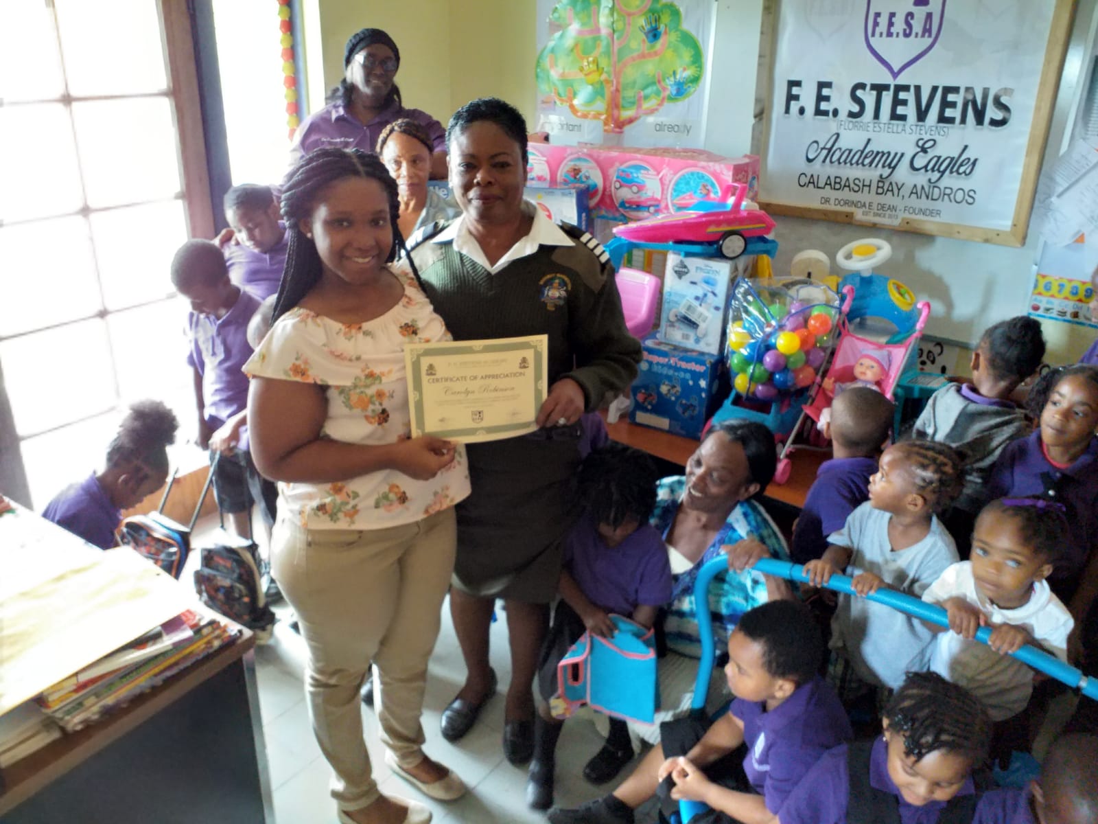SIO Carolyn Robinson presents toys, books and school bags to F.E. Stevens Pre-School in Calabash Bay;