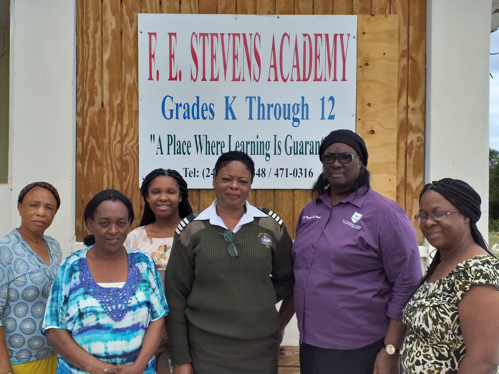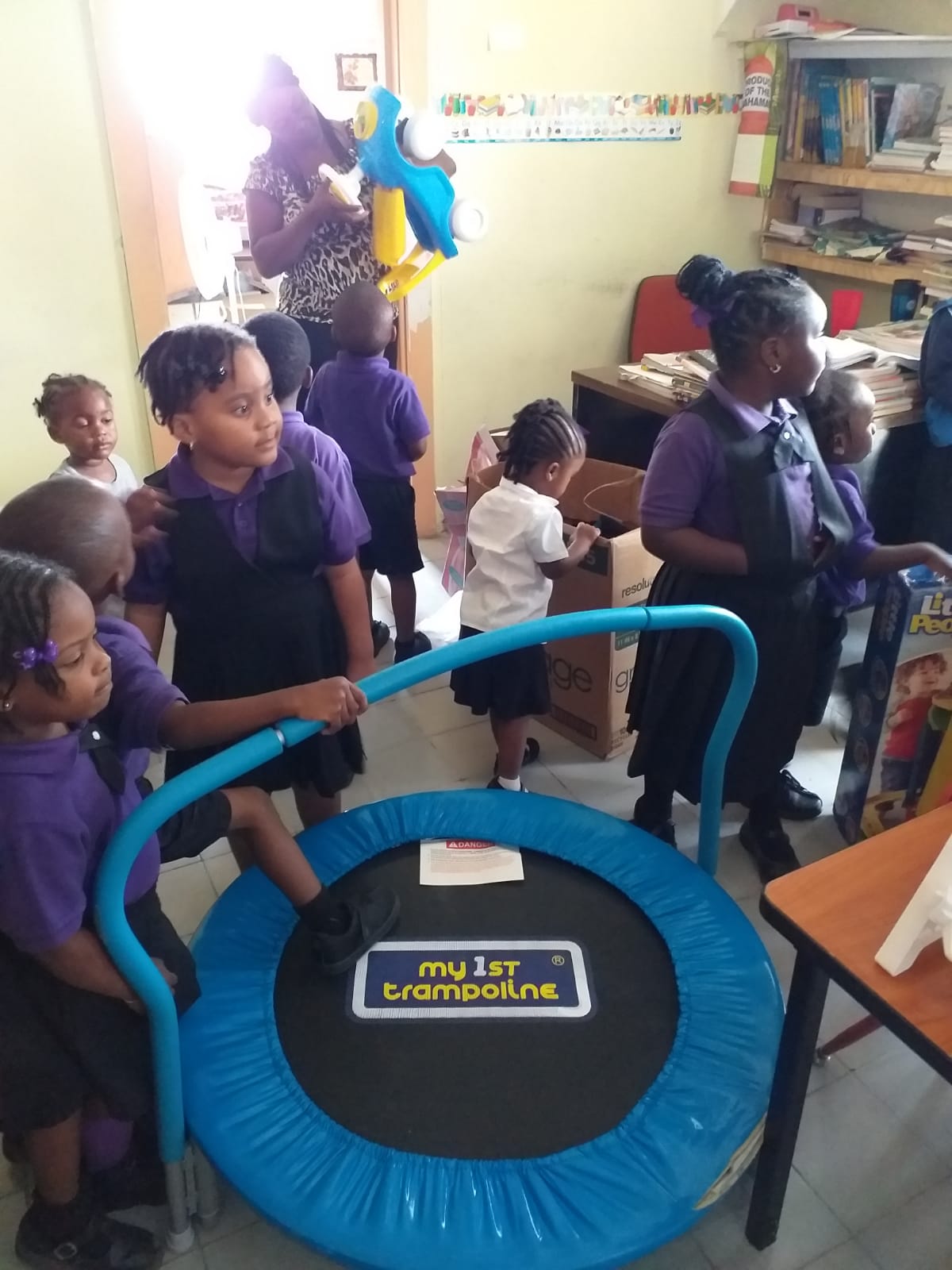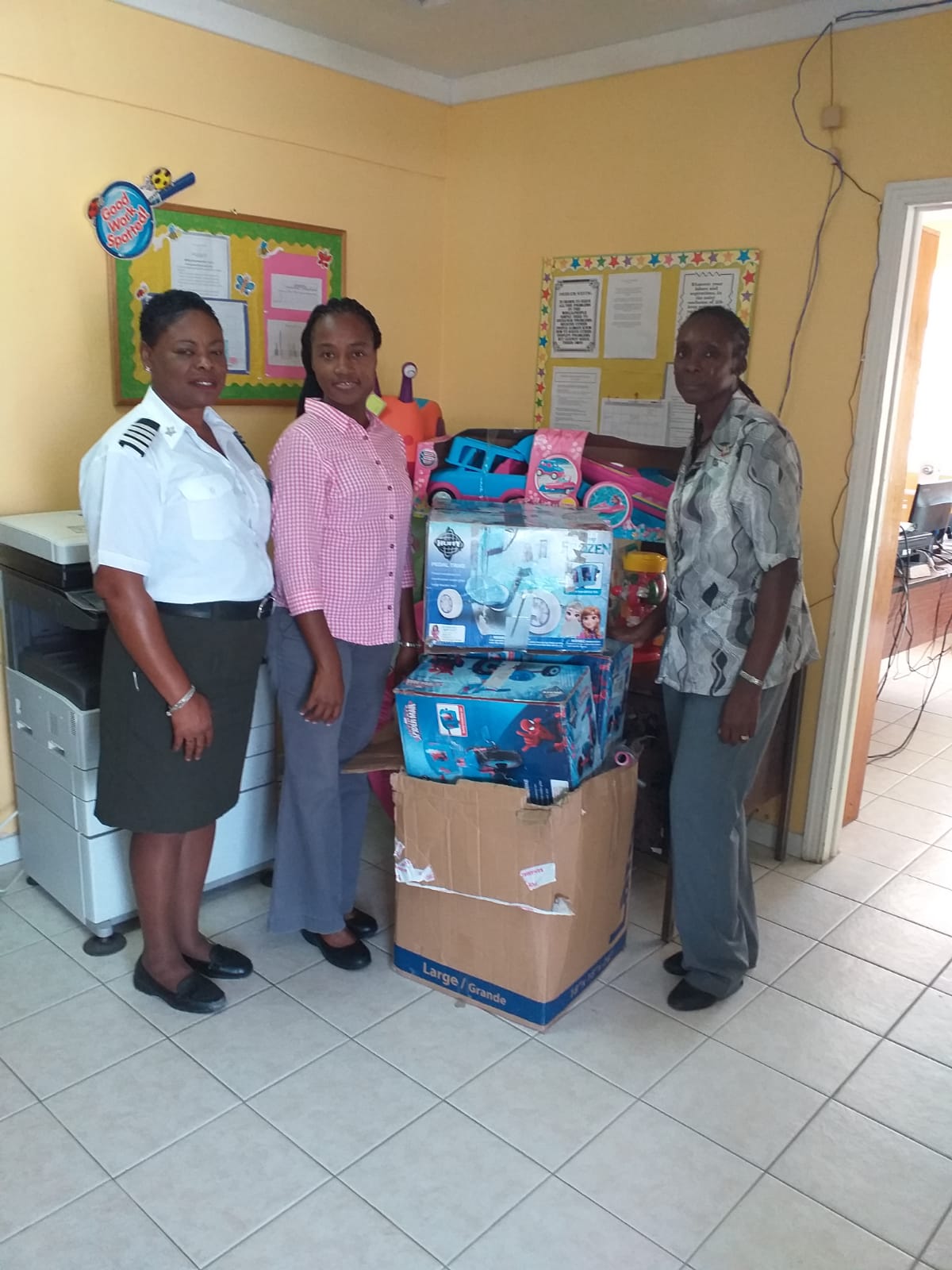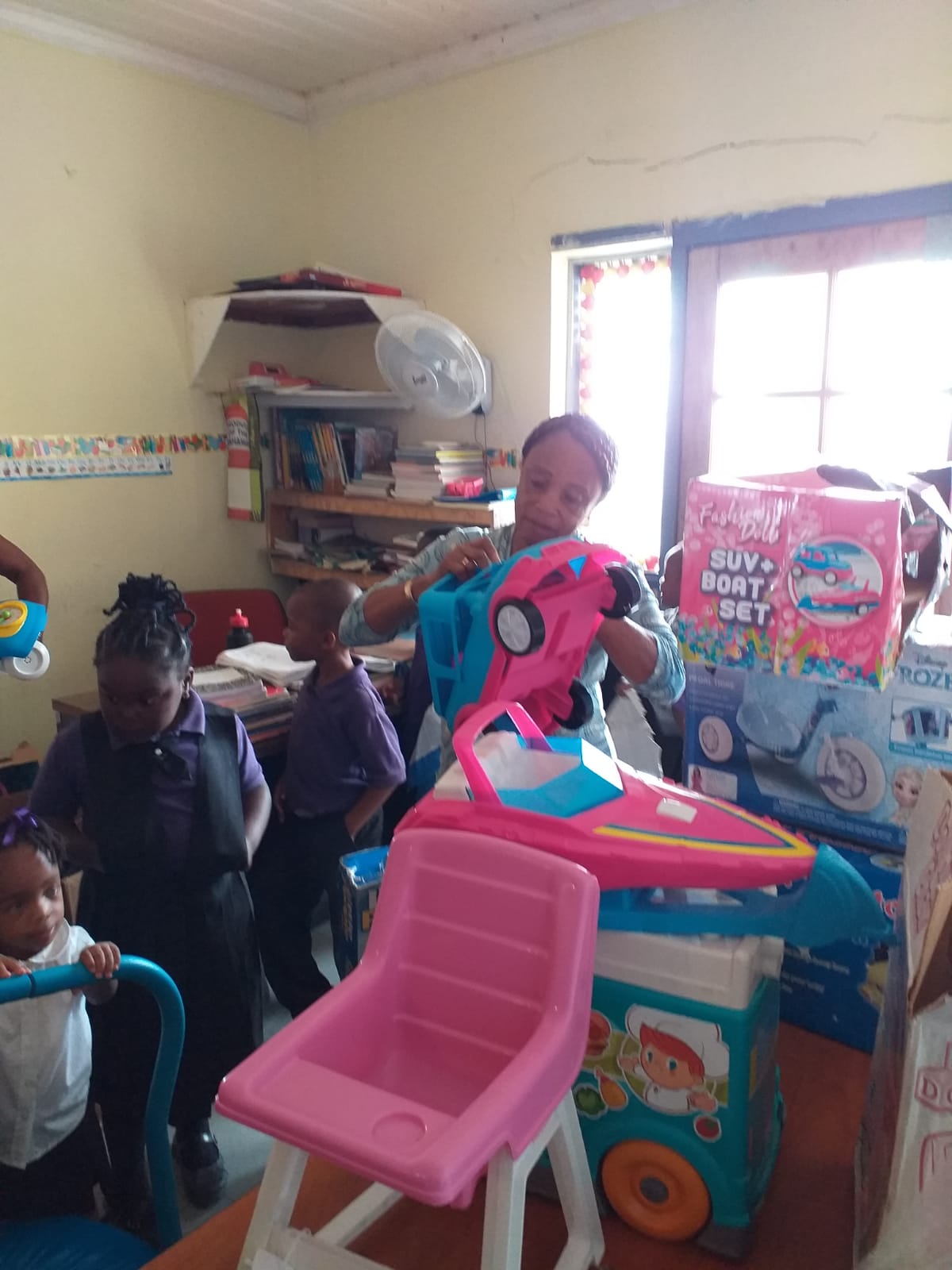 SIO Carolyn Robinson presents toys, books and school bags to F.E. Stevens Pre-School in Calabash Bay;