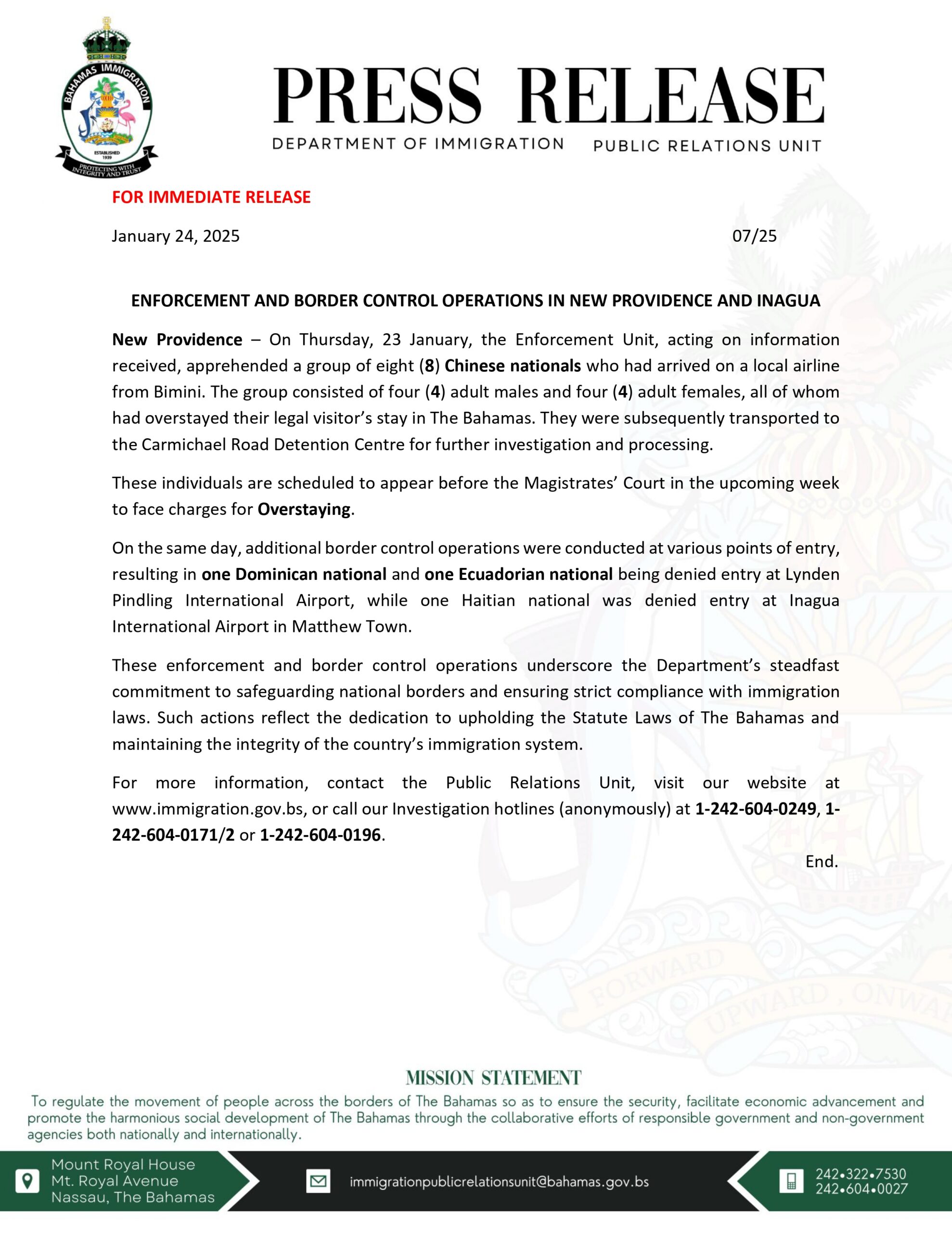 Press Release No. 07/2025 – Enforcement and Border Control Operations in New Providence and Inagua