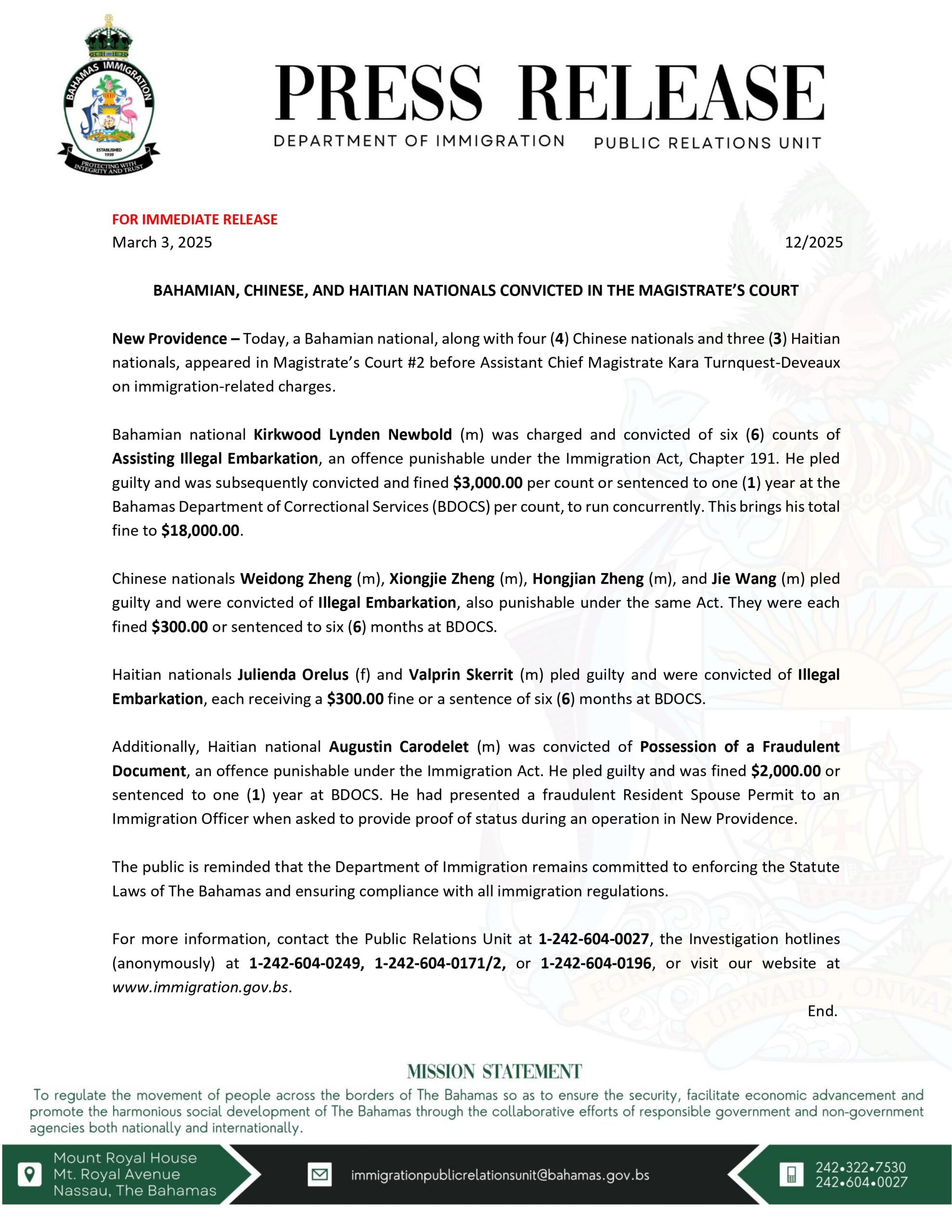Press Release No 12 – Bahamian, Chinese and Haitian Nationals Convicted in the Magistrate’s Court
