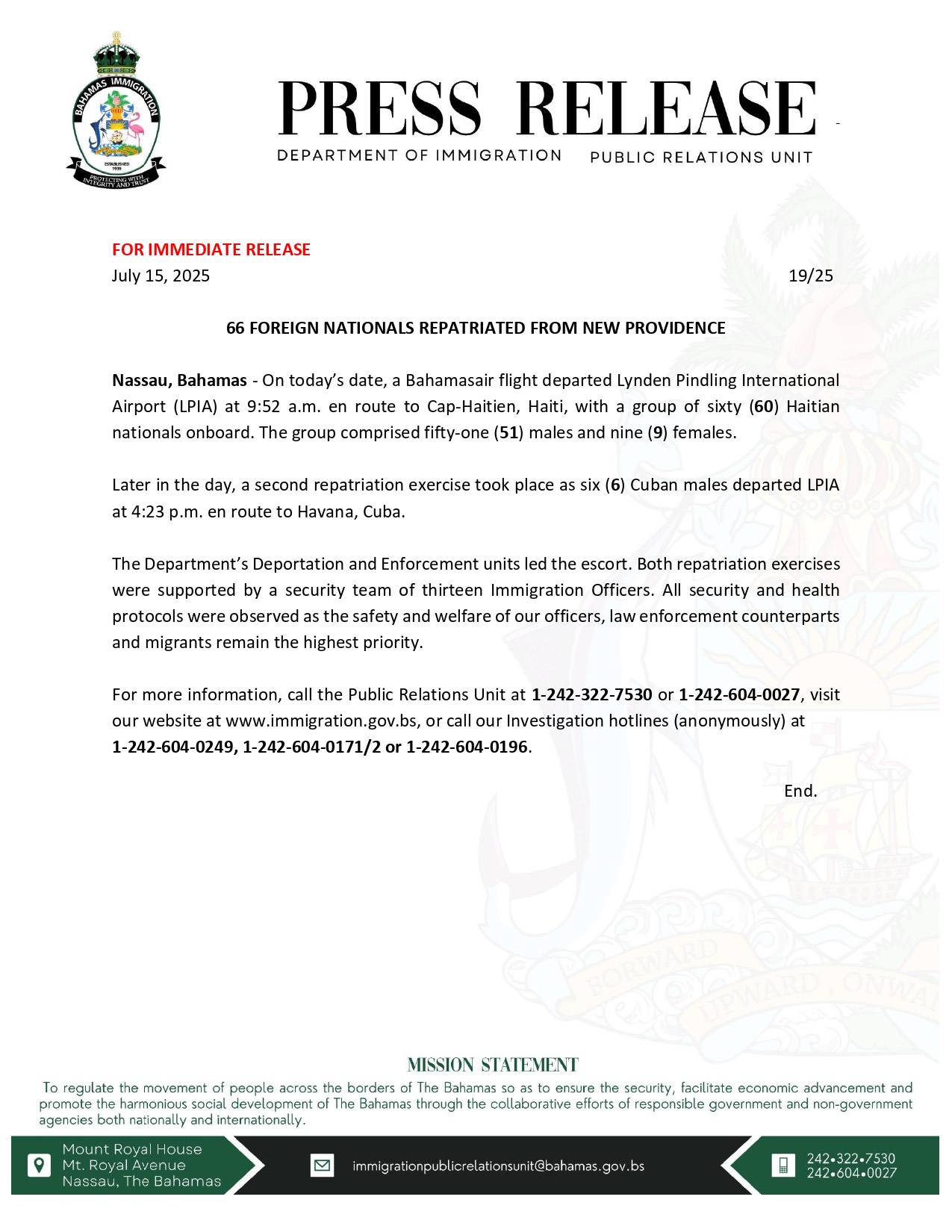 Press Release No. 19 – 66 Foreign Nationals Repatriated From New Providence