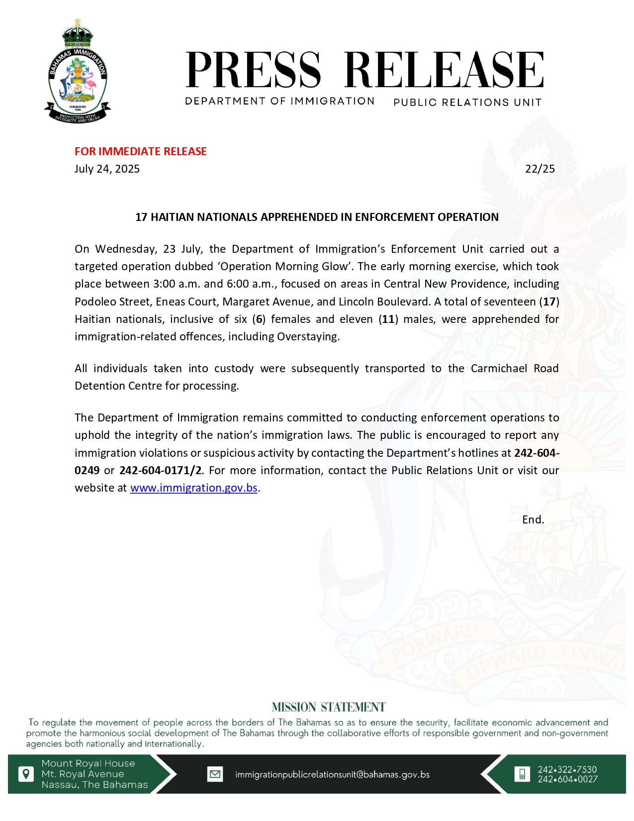 Press Release No. 22 – 17 Haitian Nationals Apprehended in Enforcement Operation