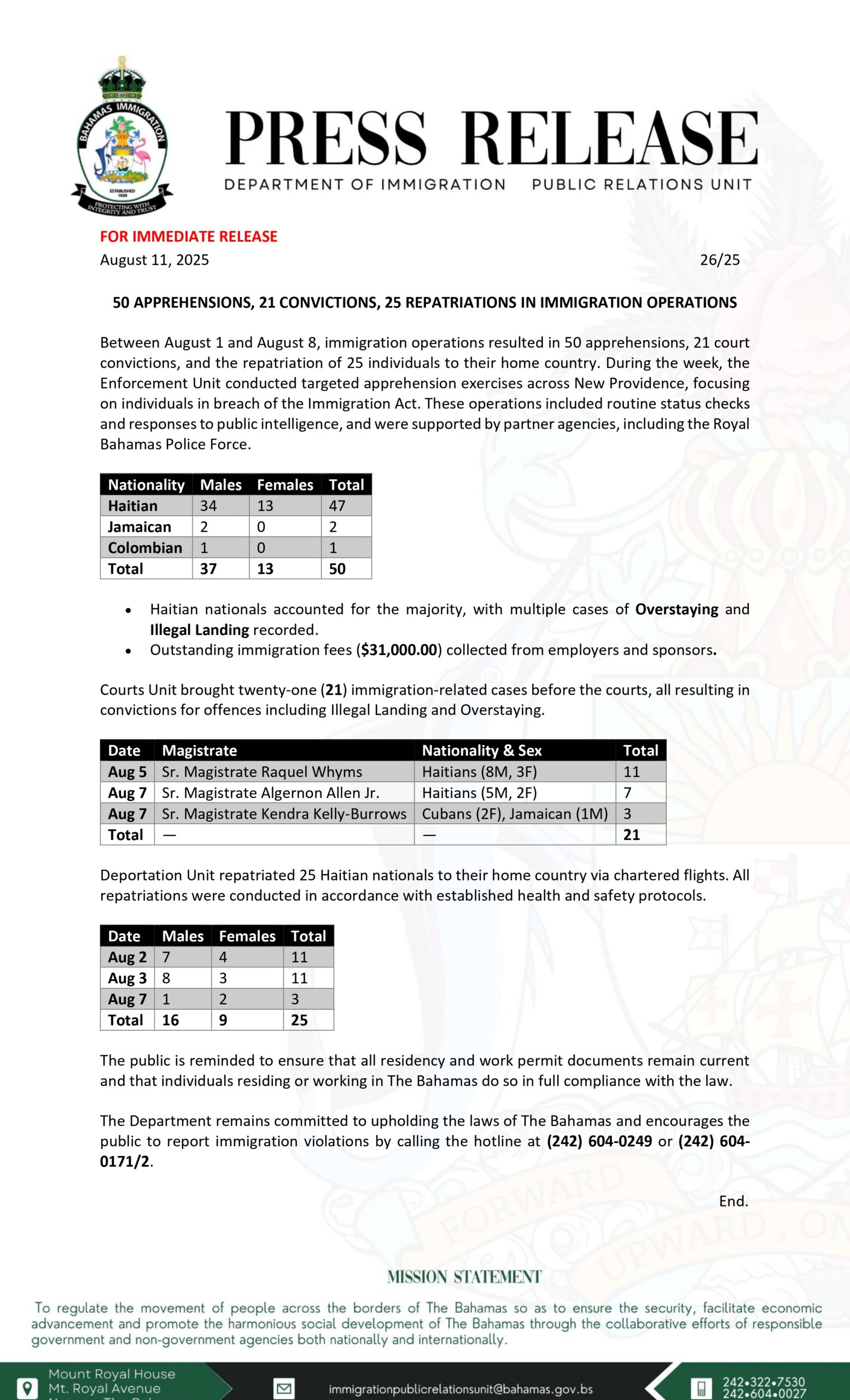 Press Release No. 26 – 50 Apprehensions, 21 Convictions, 25 Repatriations in Immigration Operations