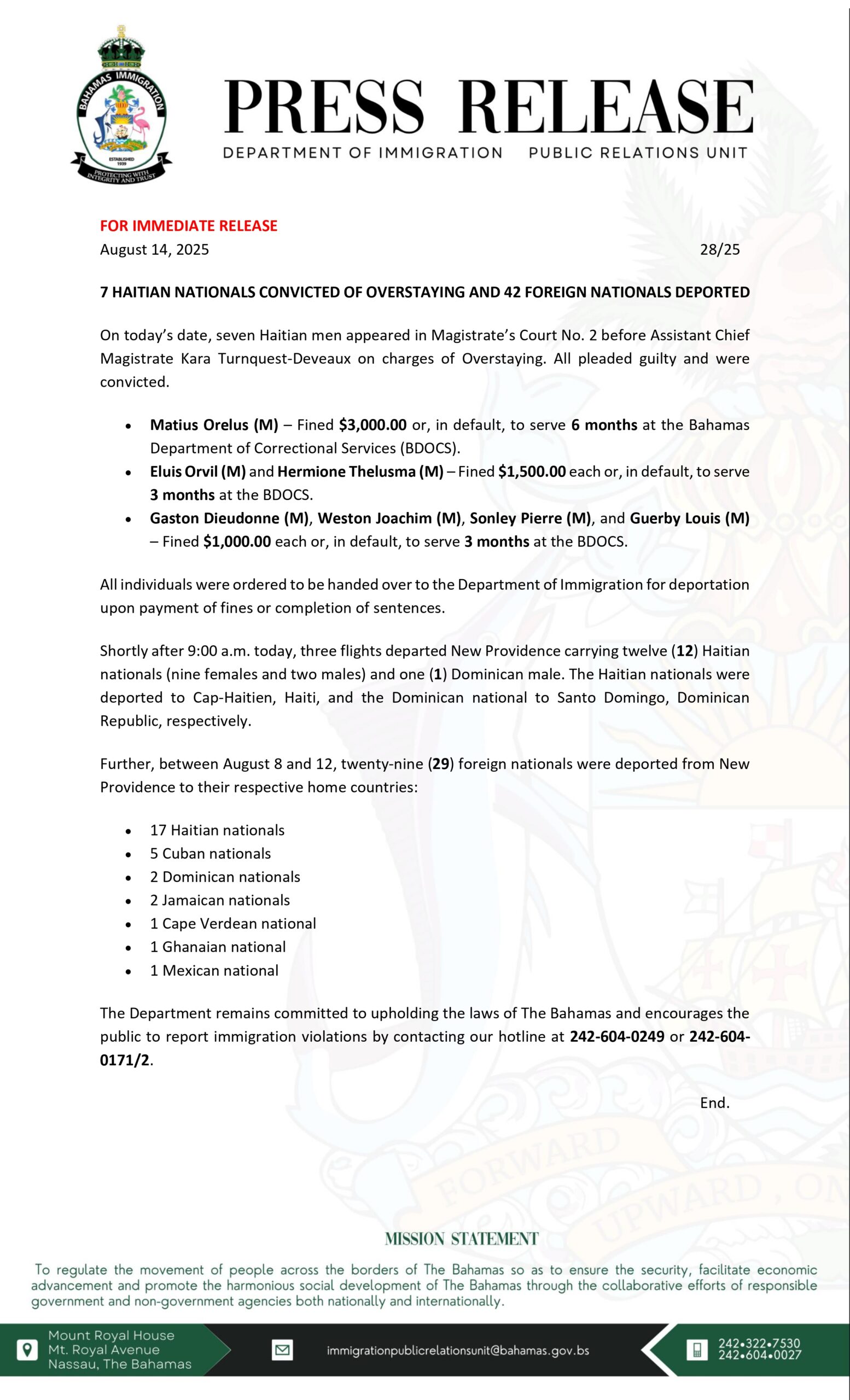 7 Haitian Nationals Convicted of Overstaying and 42 Foreign Nationals Deported