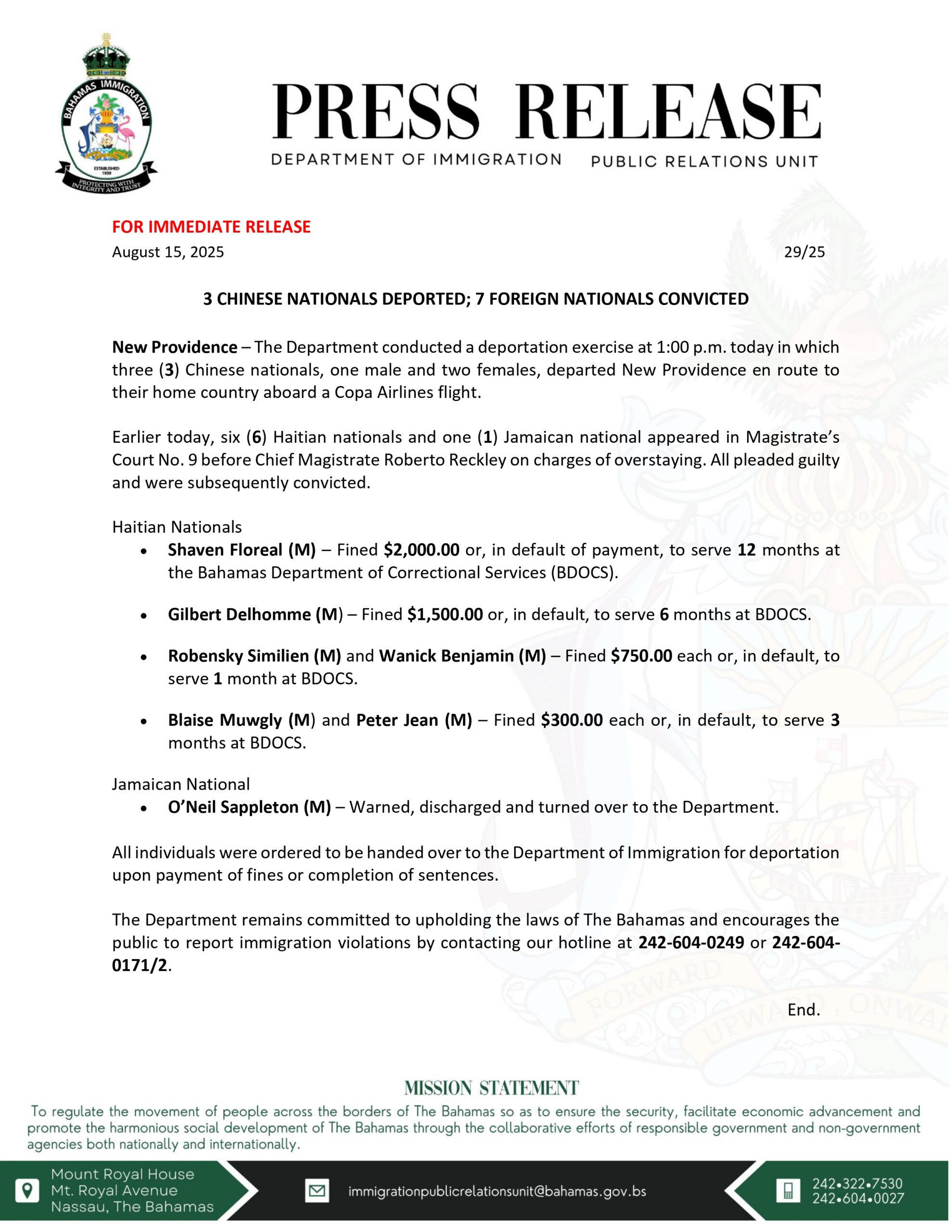 3 Chinese Nationals Deported; 7 Foreign Nationals Convicted