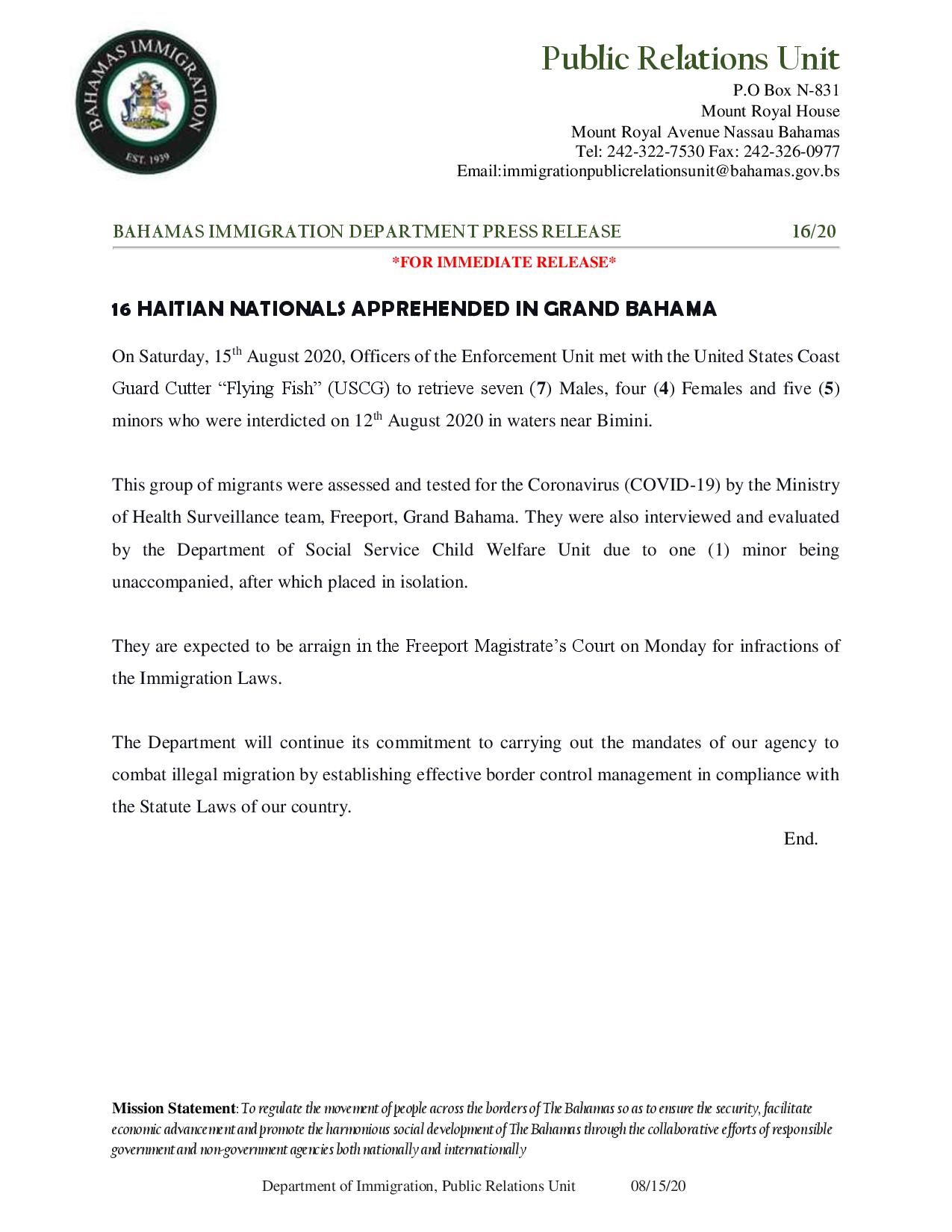Sixteen (16) Haitian nationals apprehended in Grand Bahama