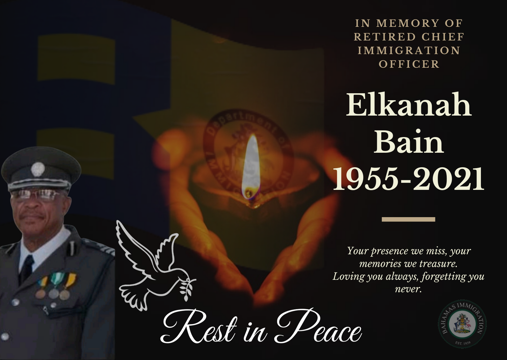 It is with deepest regret that we in the Department of Immigration express our heartfelt sympathy to the wife and family of retired Chief Immigration Officer Elkanah Bain, affectionately called “Kino”, on the Island of Grand Bahama.